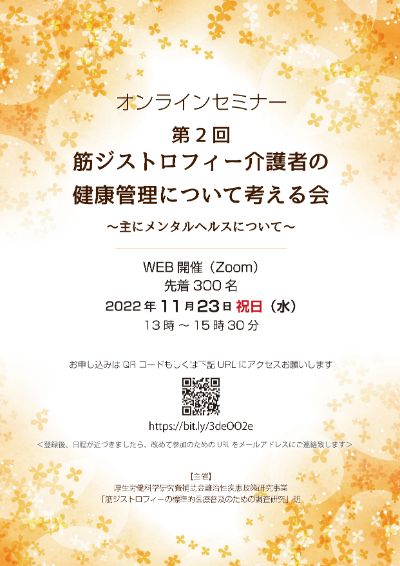 概要:筋ジストロフィー患者の介護にあたるご家族・支援者の方の健康管理について、医師と当事者、支援者、心理専門の研究者がそれぞれの立場からオンラインで講演を行いました。