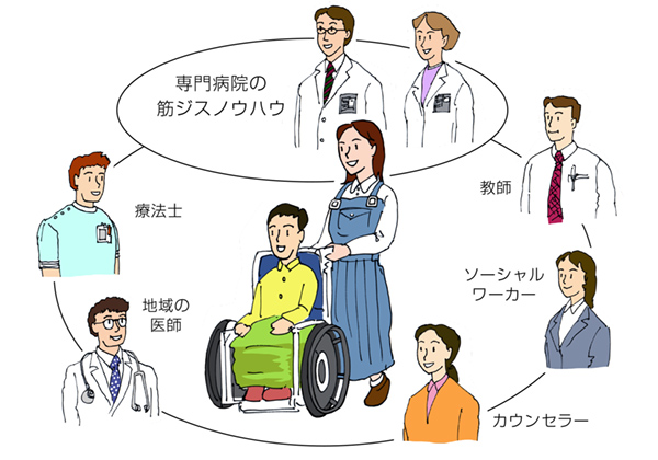 専門病院と地域の医療機関・関連職種との連携は、患者さんの身近にいるさまざまな職種の方に筋ジストロフィーを知ってもらい、患者さんを地域で支えること、患者さんが治験を望むときに参加できるようにすること、の双方で大切です。