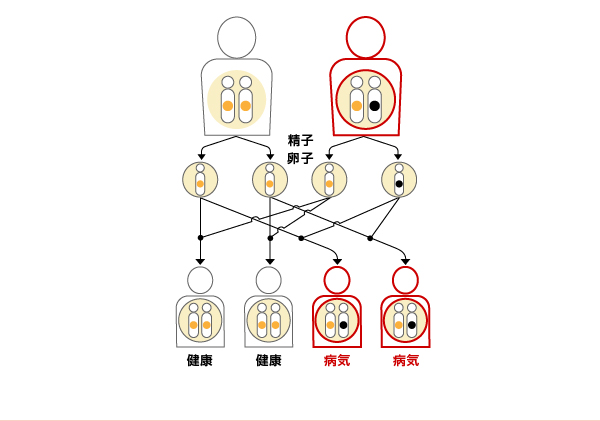 両親のうち、どちらかに病気の原因となる遺伝子変異がある場合、子どもが同じ病気になる確率は一回の妊娠につき50パーセントです。