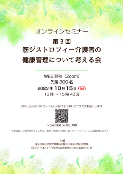 2023年10月15日(日)、オンラインセミナー「第3回 筋ジストロフィー介護者の健康管理について考える会」を開催します。