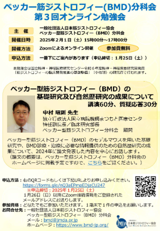 一般社団法人日本筋ジストロフィー協会 ベッカー型筋ジストロフィー(BMD)分科会が主催する「第3回オンライン勉強会が2月1日(土)15:00~17:00に開催されます。