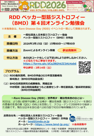 2026年3月15日(日)、一般社団法人日本筋ジストロフィー協会のベッカー型筋ジストロフィー(BMD)分科会が、「BMD第4回オンライン勉強会」を開催します。