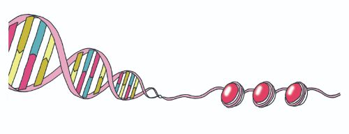 DNAはヒストンと呼ばれる糸巻きのようなものに巻き付いています。遺伝情報を使わない部分は糸巻き同士が固まっています(遺伝子発現抑制状態)が、遺伝子が発現する部分は糸巻きがほぐれ、DNAの遺伝情報が読み取れる状態になります。