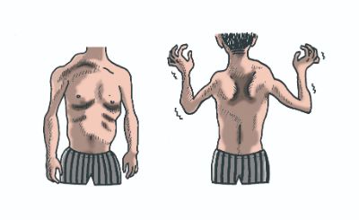 - 翼状肩甲(上肢を前方に挙上すると肩甲骨が背中から飛び出て見える)