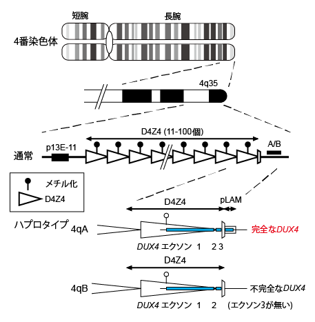 4番染色体長腕の端には、3.3kbの長さの繰り返し配列D4Z4があり、通常では繰り返し回数は11~100回程度の範囲にあります。このD4Z4にはDUX4遺伝子の一部(エクソン1, 2)が存在します。D4Z4繰り返し配列のさらに端の遺伝子配列には、幾つかのパターン(ハプロタイプ)が存在します。このうち4qAタイプにのみDUX4遺伝子のエクソン3があります。このため、4qAタイプでは、完全なDUX4遺伝子(エクソン1,2,3の全て)が存在するのですが、それ以外の方には完全なDUX4遺伝子はない(エクソン3がない)ため、完全長のDUX4遺伝子が発現することはありません。