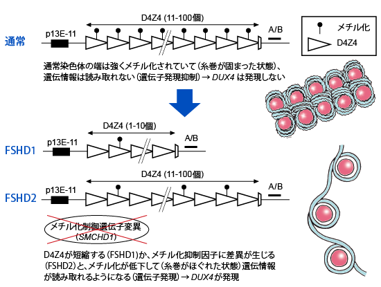 メチル化が低下する要因には、(i)D4Z4の繰り返しが1~10回に減少する、(ii)メチル化を制御する遺伝子に変異が生じる、の2種類があります。